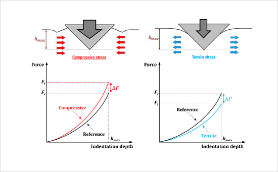 Change in morphology and indentation force-depth curve with stress variation, illustrating the influence of stress changes on the material's response to indentation